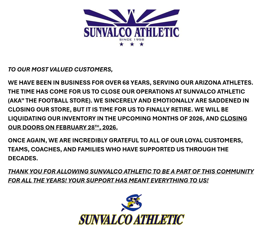 SUNVALCO ATHLETIC AKA “THE FOOTBALL STORE” WILL NO LONGER BE